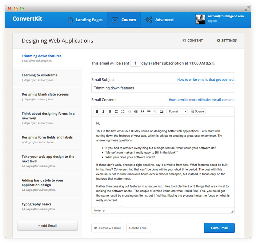 Initially the app just had three tabs: landing pages, courses, and advanced. I always hated the term autoresponder, which was common at the time, so I chose course instead. We later renamed course to sequence.