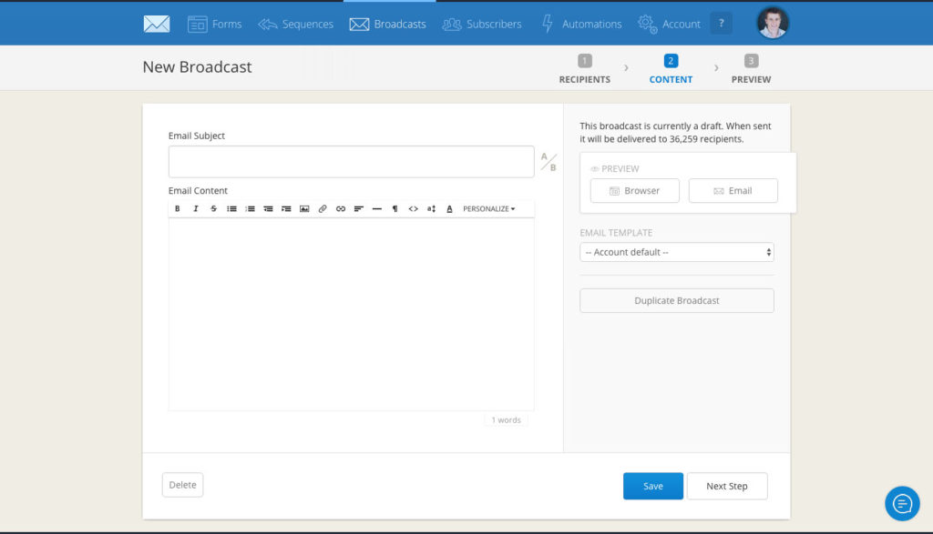 In June 2013 we added basic list functionality (the subscribers in a group of forms) and the ability to send broadcasts to them. Around this time I was able to start to fully move from MailChimp to ConvertKit for everything.