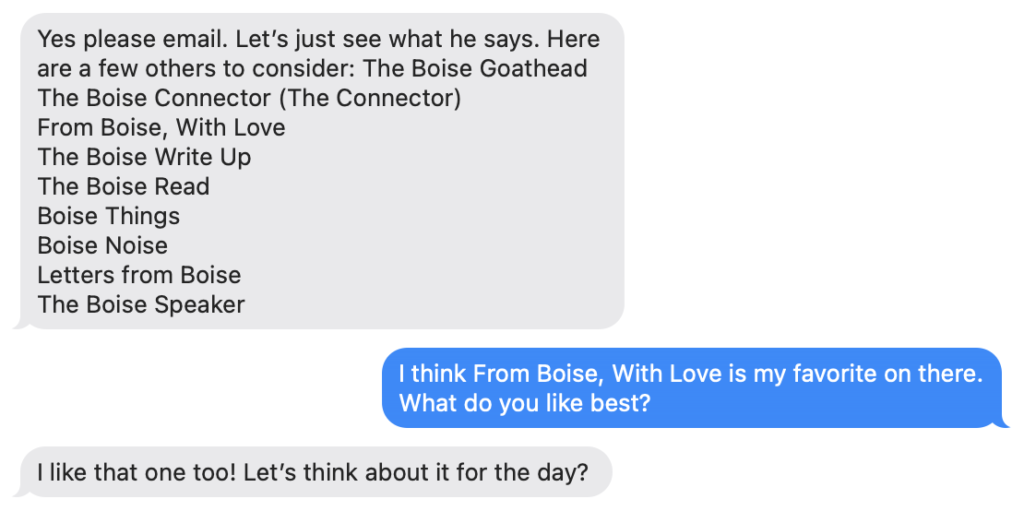 Marissa and I were texting and she suggested “The Boise Connecter” which is owned by someone else (but not used). I said I could reach out when she made a few other suggestions: