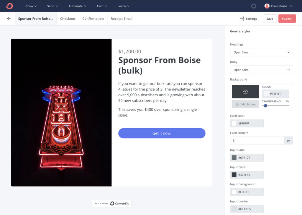 Everything for From Boise is powered by ConvertKit. The website, email newsletter, public blog posts, sponsorships, and automation happens inside ConvertKit. Really the only outside tool we use is Google Apps for running the email accounts and for docs and sheets.