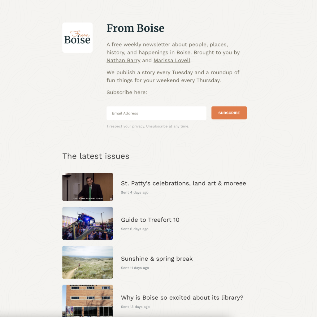 I’m very fortunate to be able to launch a venture like From Boise, build it to 10,000 subscribers, and not have it take up much time at all (I spend an hour or two a week on it at most). Hopefully this gives you some insight into what it takes to build a similar venture.