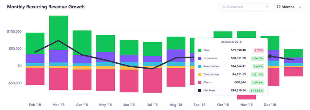 When everyone looks at Baremetrics they immediately look at the MRR—as they should. It’s the most important metric in the business. But what most novices miss is that MRR growth is actually the summary of five metrics: new, expansion, reactivation, contraction, and churn. So the most interesting graph isn’t total MRR, but instead the breakout further down the page.