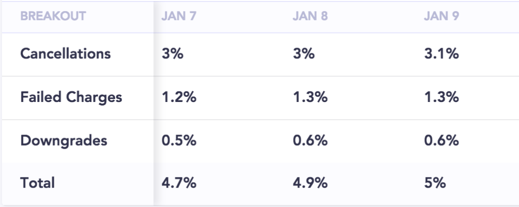 It’s also helpful to see a further breakout in revenue churn between cancelations, downgrades, and failed charges. This shows us that failed charges are decently high and there is some more work we could do there.