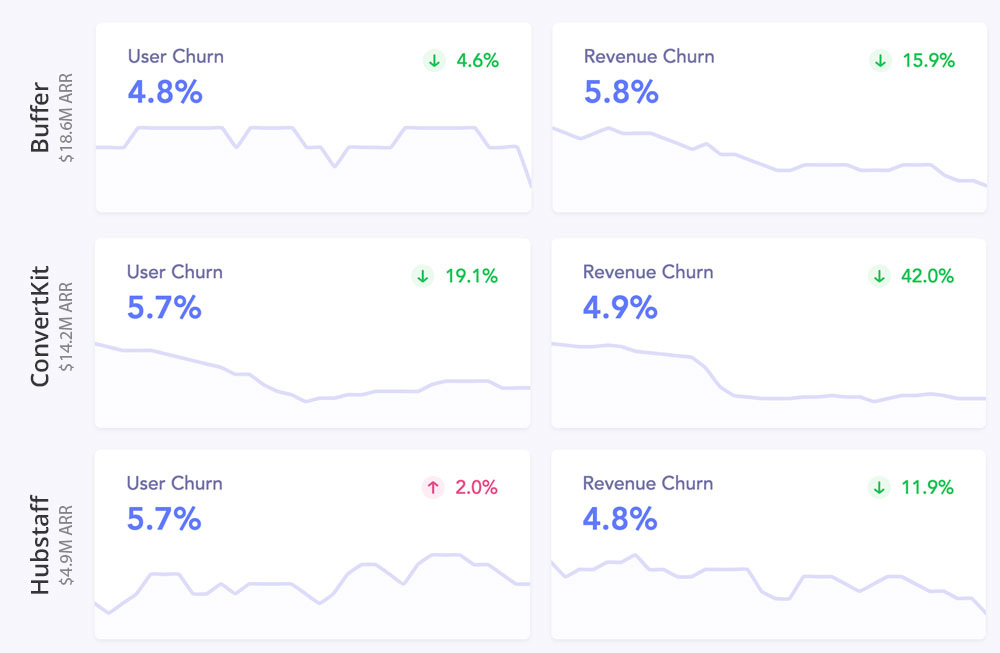 I found it really interesting to compare ConvertKit, Buffer, and Hubstaff (the three largest companies on Open Startups). The churn numbers are very similar! Though Buffer has a higher revenue churn than user churn.